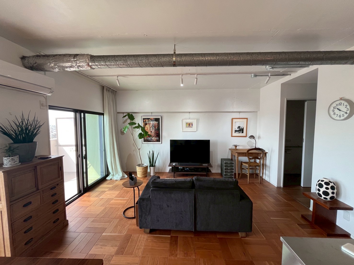 天井の配管をあえて隠さず、内壁を塗装で仕上げたマンションリノベならではのこだわりのLDKへ仕上げました。
