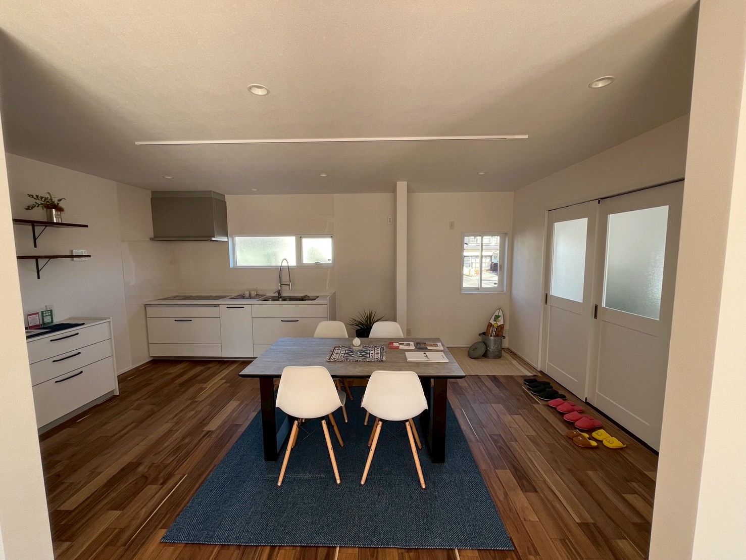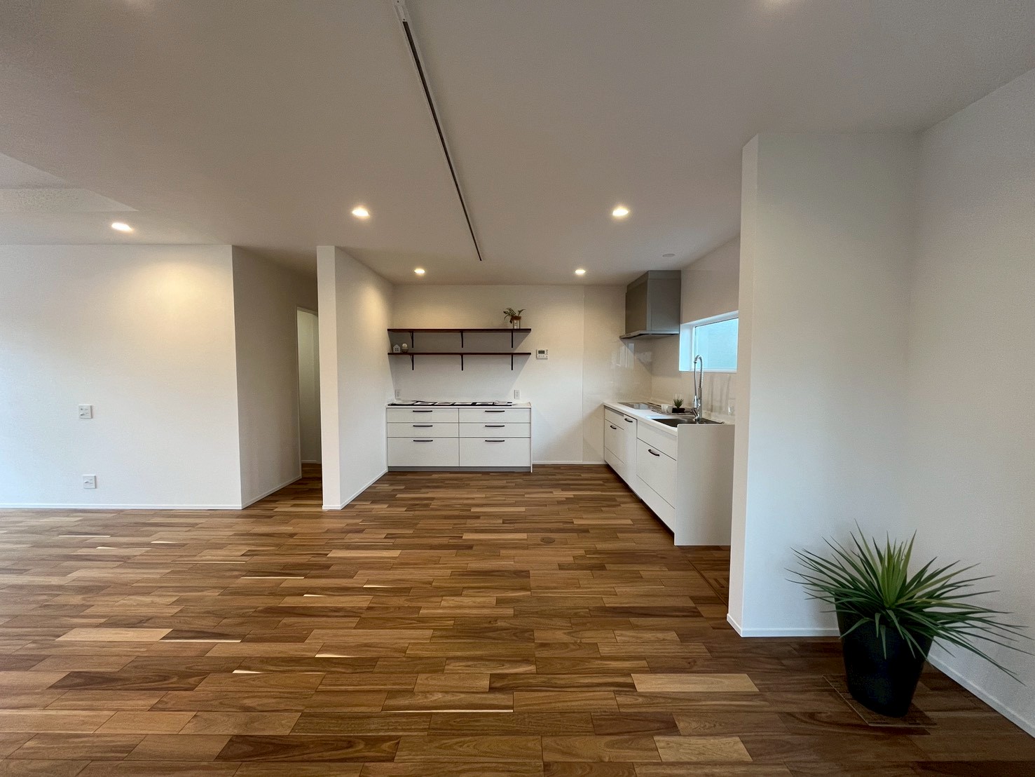 開放感あふれる大空間の LDK は、家族との時間を心地よく感じられる空間になっており、その奥には落ち着いたプライベート空間・水回りを配置。