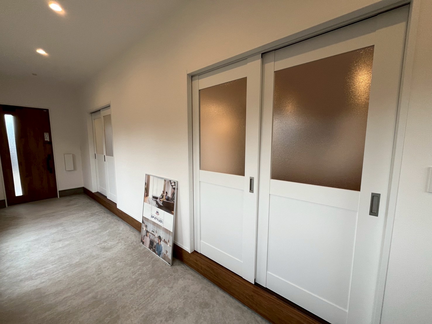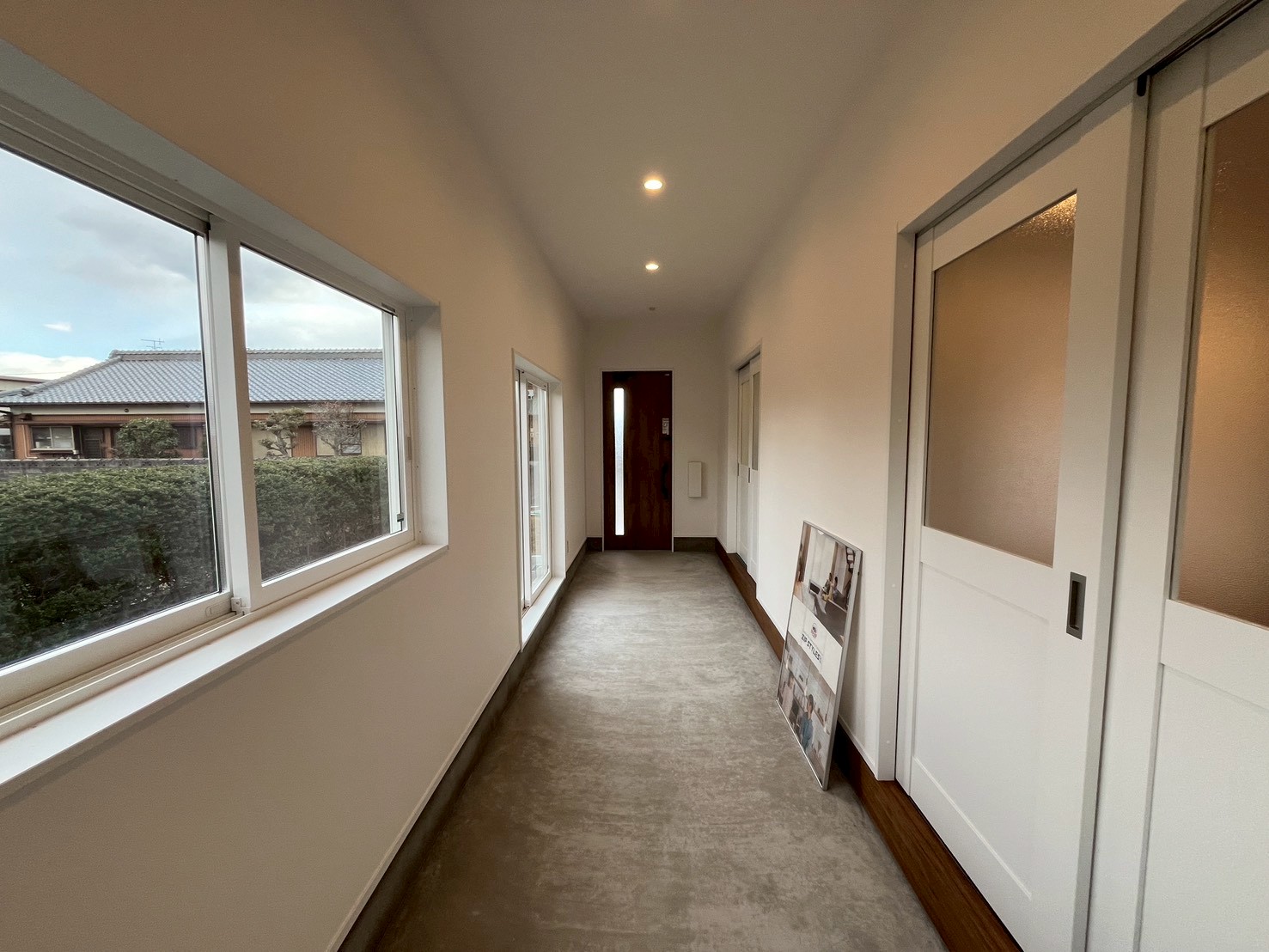 玄関を入ると奥へと伸びる開放的な土間空間。このスペースは、趣味の道具を置いたり、多目的に活用できるのが魅力。